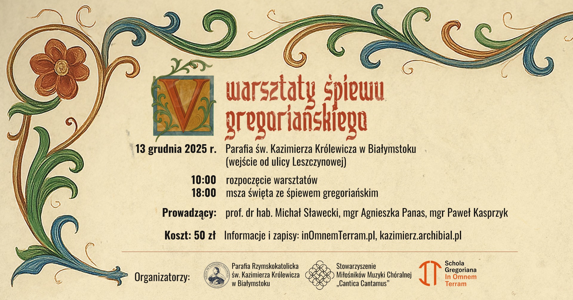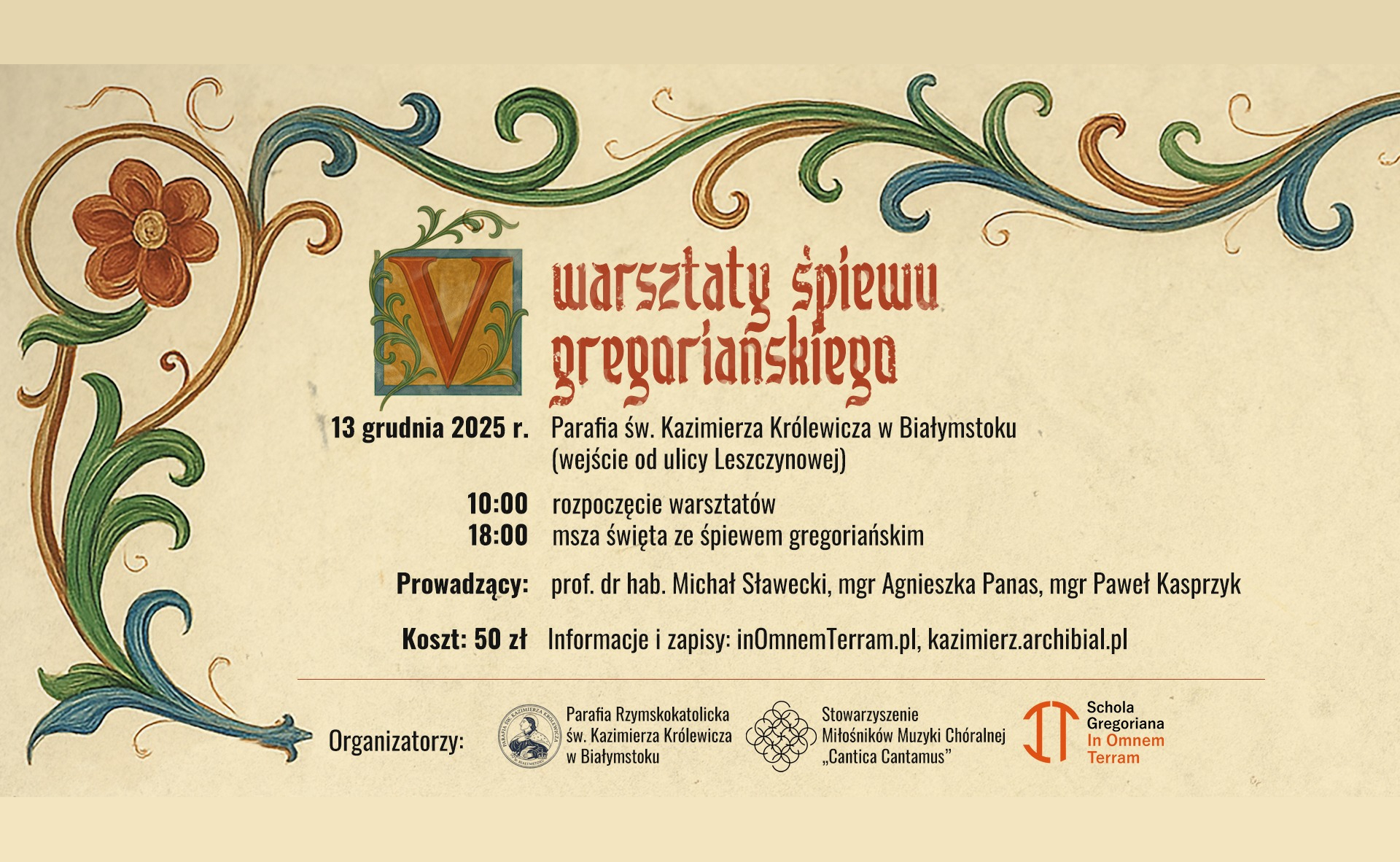 Zapraszamy na V Warsztaty Śpiewu Gregoriańskiego, które odbędą się w sobotę, 13 grudnia 2025 r. To okazja do praktycznej nauki stylu i interpretacji w oparciu o semiologię gregoriańską – optykę, która przez zwrot do najstarszych zachowanych źródeł i notacji muzycznych pozwala zbliżyć się do autentycznego brzmienia śpiewu gregoriańskiego.